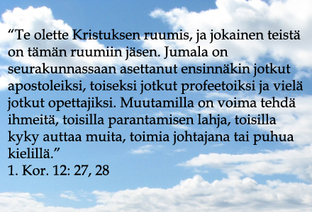 Seurakunta on yksi ruumis, mutta siinä on monta jäsentä, jotka on kutsuttu kaikista kansoista, heimoista, kielistä ja maista. Kristuksessa olemme uutta luomakuntaa; rotua, kulttuuria, koulutusta ja kansallisuutta koskevien erilaisuuksien tai eron ylhäisen ja alhaisen, rikkaan ja köyhän, miehen ja naisen välillä ei tule erottaa meitä toisistamme.